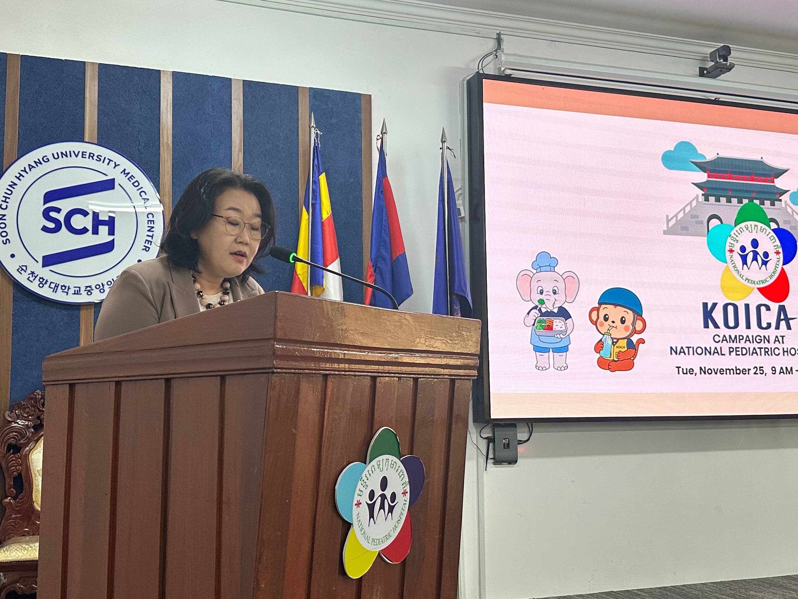 ជាកិច្ចចាប់ផ្តើម លោកជំទាវ បានថ្លែងអំណរគុណយ៉ាងជ្រាលជ្រៅដល់រដ្ឋាភិបាលសាធារណរដ្ឋកូរ៉េ ដែលបានចូលរួមគាំទ្រដល់ការពង្រឹងសេវាសុខភាពកុមារ និងអាហារូបត្ថម្ភនៅមន្ទីរពេទ្យកុមារជាតិ តាមរយះកម្មវិធីអ្នកស្ម័គ្រចិត្តកូរ៉េនៅកម្ពុជា។
