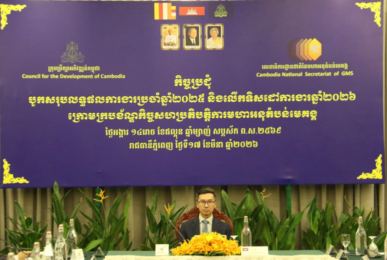 នារសៀលថ្ងៃអង្គារ ១៤រោច ខែផល្គុន ឆ្នាំម្សាញ់ សប្តស័ក ព.ស. ២៥៦៩ ត្រូវនឹងថ្ងៃទី១៧ ខែមីនា ឆ្នាំ២០២៦ នៅសណ្ឋាគារកាំបូឌីយ៉ាណា ឯកឧត្តម ជូ ហេង អគ្គលេខាធិការរងគណៈកម្មាធិការសហប្រតិបត្តិការអភិវឌ្ឍន៍កម្ពុជានៃក្រុមប្រឹក្សាអភិវឌ្ឍន៍កម្ពុជា (គ.ស.អ.ក/ក.អ.ក)និងជាអ្នកសម្របសម្រួលជាតិនៃមហាអនុតំបន់មេគង្គ (Greater Mekong Subregion) បានដឹកនាំកិច្ចប្រជុំបូកសរុបលទ្ធផលការងារប្រចាំឆ្នាំ២០២៥ និងលើកទិសដៅការងារឆ្នាំ២០២៦ របស់កម្មវិធីកិច្ចសហប្រតិបត្តិការនៃមហាអនុតំបន់មេគង្គ ។ កិច្ចប្រជុំនេះមានការអញ្ជើញចូលរួមពី ឯកឧត្តម លោកជំទាវ ជារដ្ឋលេខាធិការ អនុរដ្ឋលេខាធិការ តំណាងជាន់ខ្ពស់ក្រសួង-ស្ថាប័នពាក់ព័ន្ធរបស់រាជរដ្ឋាភិបាល និងតំណាងបណ្ដាញពុទ្ធិ សរុបប្រមាណ៧០រូប ។ កិច្ចប្រជុំនេះត្រូវបានរៀបចំឡើងក្នុងគោលបំណងពិនិត្យ បូកសរុប និងវាយតម្លៃលទ្ធផលការងារដែលបានសម្រេចបានក្នុងឆ្នាំ២០២៥ ព្រមទាំងកំណត់ទិសដៅ និងអាទិភាពការងារសម្រាប់អនុវត្តបន្តនៅឆ្នាំ២០២៦ ឱ្យកាន់តែមានប្រសិទ្ធភាព សក្តិសិទ្ធភាព និងសមស្របតាមតម្រូវការនៃការអភិវឌ្ឍក្នុងក្របខ័ណ្ឌ GMS ។