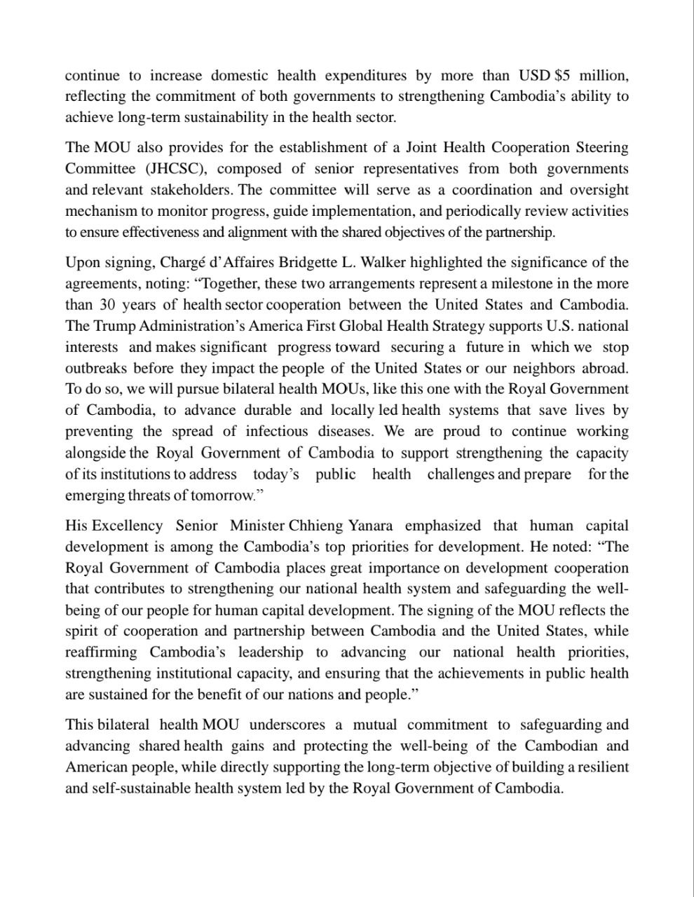 On 02 April 2026, His Excellency Senior Minister Chhieng Yanara, Second Vice-Chairman of the Council for Development of Cambodia, and His Excellency Prof. Chheang Ra, Minister of Health, signed a bilateral health Memorandum of Understanding (MOU) and a Data Sharing Agreement (DSA) on behalf of the Royal Government of Cambodia, with Chargé d’Affaires Bridgette L. Walker of the United States Embassy. This five-year, $36 million MOU underscores a shared commitment and cooperation to protect the well-being of our people and advance a resilient and sustainable health system under the leadership of the Royal Government of Cambodia.